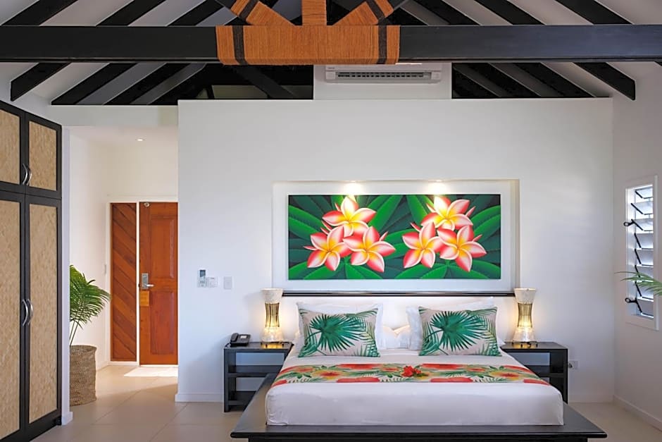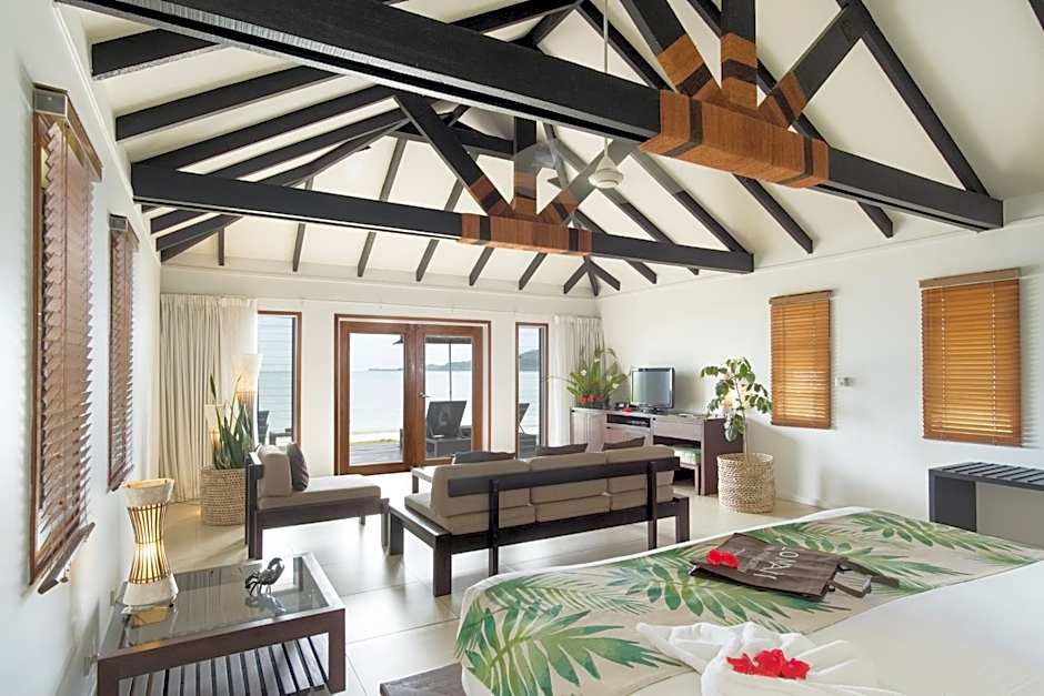 Built in 2016, this beachfront bure is located steps away from a pristine, white sandy beach. The luxurious bure features a private plunge pool, a day bed, custom made mahogany wood furnishings, private courtyard-style outdoor showers and a large sundeck overlooking Malolo Lailai Bay. The double glass sliding doors lead out onto the private deck, which has breathtaking views.